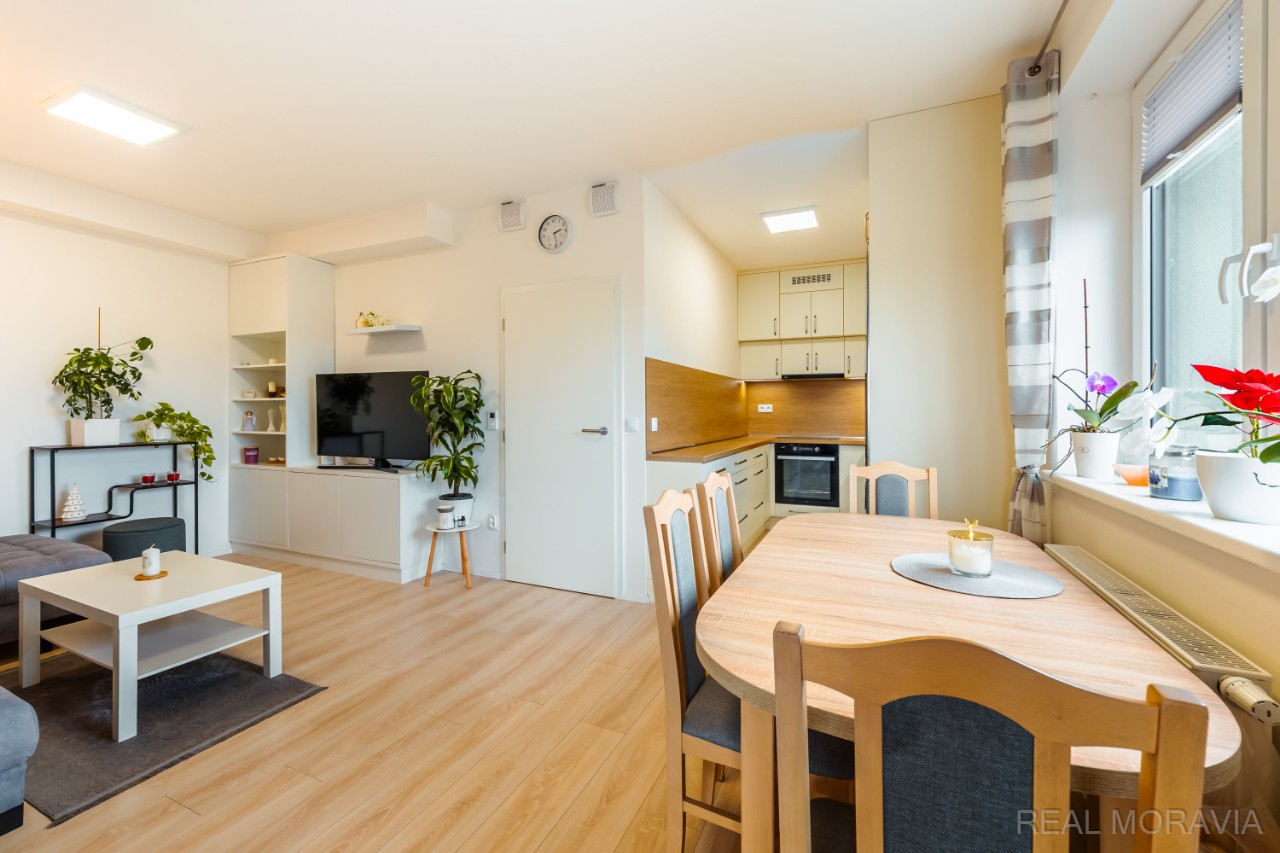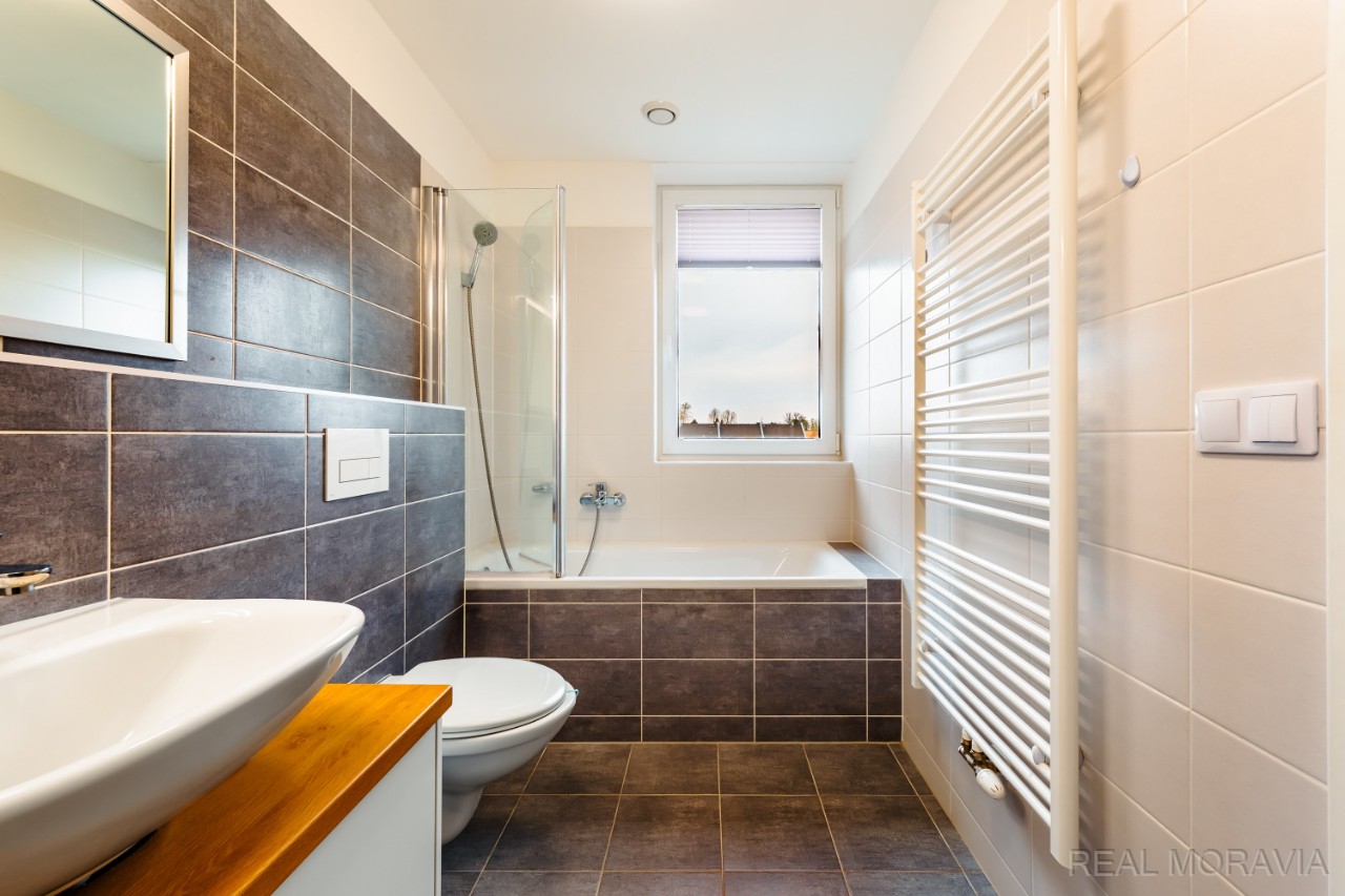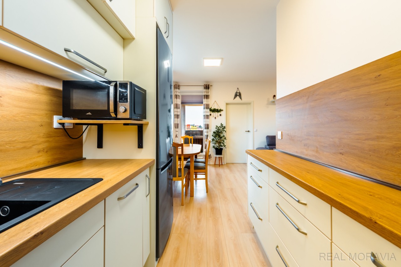 Nabízíme k pronájmu nadstandardní nový byt 2+kk v OV s velkou lodžií, komorou a venkovním parkovacím stáním ve zděném bytovém domě ve vyhledávané lokalitě města Prostějov, ul. J. Sedláčka. Byt s pěknou dispozicí se nachází ve 3.NP (2.patro) menšího pětipodlažního bytového domu s výtahem a má výměru 59,9 m² vč. lodžie (6,9 m²) a komory v mezipatře (3,4 m²). Dům byl postaven a zkolaudován v roce 2023, je zděný, s výtahem a parkovacími místy před domem. V bytě je chodba s věšákovou stěnou a botníkem, pěkná koupelna s vanou se sprchovou zástěnou, umyvadlem se skříňkou, WC, otopným žebříkem (okno, místo pro pračku), útulná ložnice s vestavěnou skříní přes celou hloubku místnosti, světlý obývací pokoj (sestava skříněk) s kuchyňským koutem - moderní kuchyňská linka z kvalitních materiálů na míru s vestavěnými spotřebiči (indukční varná deska, myčka nádobí, elektrická trouba, mikrovlnná trouba, digestoř, LED podsvícené části kuchyně, granitový keramický dřez Franke, baterie Franke). Z obývacího pokoje je přímý vstup na lodžii. Lodžie je osvětlená a je zde zásuvka. Na podlaze plovoucí podlaha, v koupelně dlažba, plast. okna (trojsklo), plisé roletky, sítě proti hmyzu, garnýže. Vnitřní dveře v provedení lamino, vstupní dveře jsou bezpečnostní. Osvětlení. Byt se pronajímá prázdný – pouze kuchyňská linka se spotřebiči a vestavěný nábytek v koupelně, ložnici a chodbě, sestava skříněk v obývacím pokoji a osvětlení. Vytápění a ohřev vody – dálkové, samostatné měřiče energií. Samostatný plynový kotel pro dům. Přípojka internet optika, společná anténa. Rekuperace. K bytu patří venkovní parkovací místo (za příplatek 1000 Kč/měsíc) a komora v mezipatře domu. Za domem k využití klidová zóna s posezením. Byt je světlý a působí vzdušně díky velkým oknům. Velmi žádaná lokalita k bydlení v pěší vzdálenosti do centra města. V blízkosti bytového domu MHD. V dostupné vzdálenosti je veškeré obč.vybavení (MŠ, ZŠ, lékaři, obchody). Volné od 1.5.2026. Měs. nájemné 15 900 Kč + zálohy na služby a energie 3 833 Kč, vratná kauce 20 000 Kč, provize RK ve výši 1 měs. nájmu bez energií. Majitel preferuje 1-2 osoby, bez domácích mazlíčků, nekuřáky, bez zatížení exekucí či insolvencí. Dlouhodobý pronájem. Kompletní informace o stavu nemovitosti obdržíte u makléře, veškeré uvedené údaje jsou pouze informativní. PENB A.